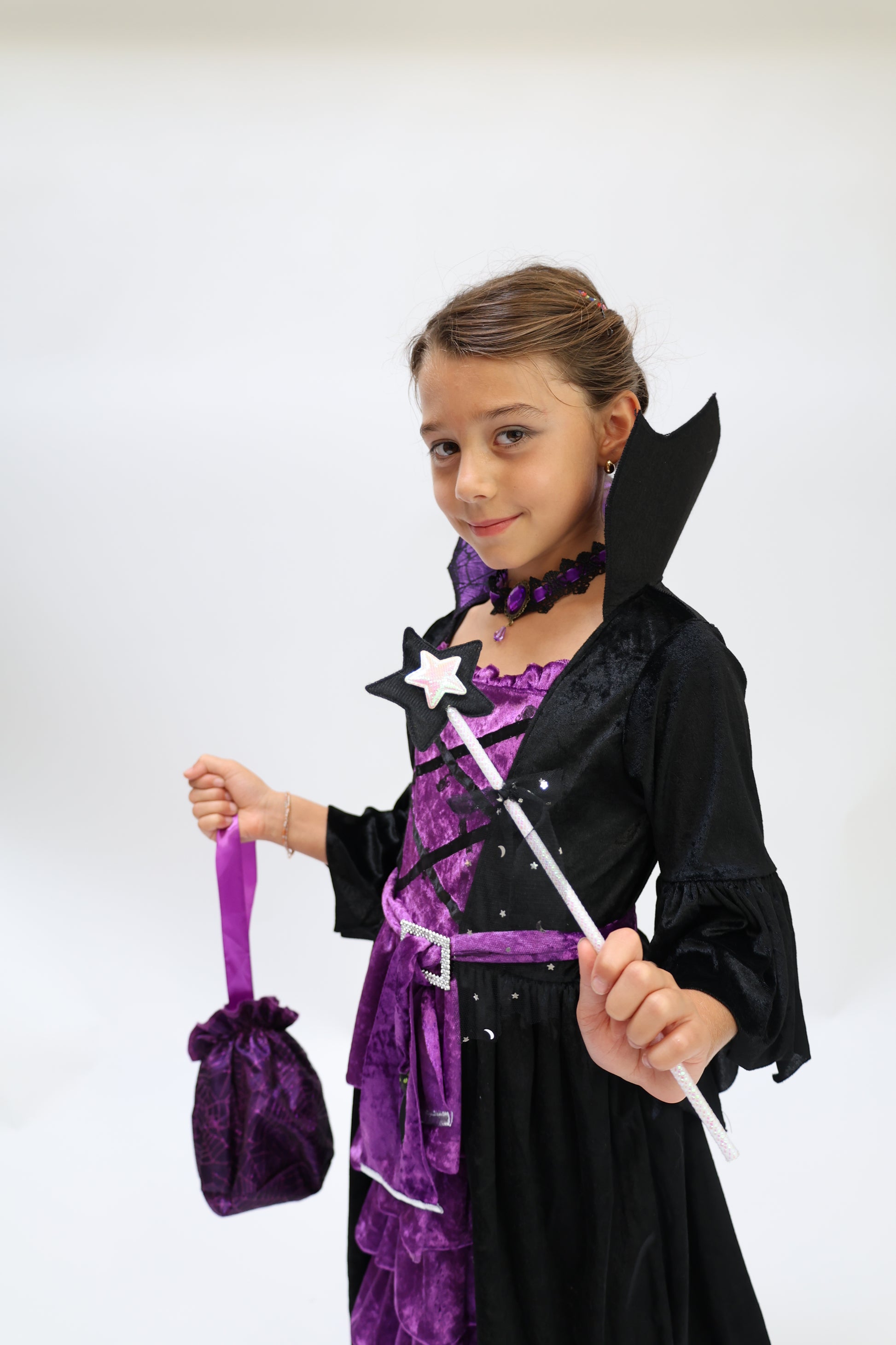 Déguisement Halloween fille – Sorcière Vampire Violet & Noir avec Sac et Ceinture Chat Noir (3 à 8 ans)